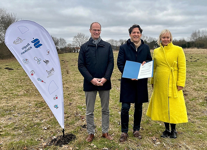 Regina Hein und Gundolf Thurm, das Geschäftsführungs-Duo der Regio Kliniken, nahmen diesen auf dem zukünftigen Klinikcampus am Ossenpadd im Norden Pinnebergs entgegen – dem Areal, auf dem bis 2033 das Zentralklinikum entstehen soll.
