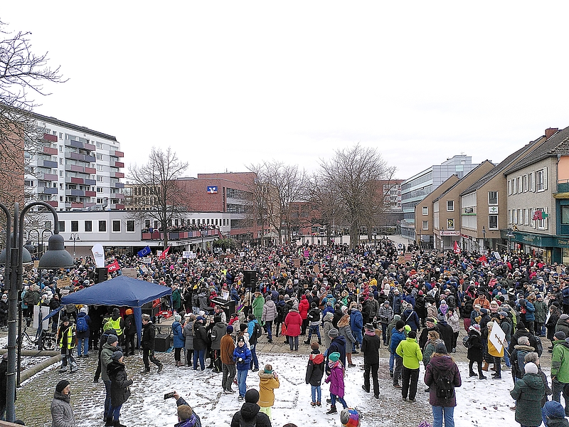Kreis Pinneberg (jhf) Mit solch einem Ansturm hatten die Veranstalter nicht gerechnet. Die Pinneberger Ortsgruppe von Fridays For Future (FFF) hatte für Sonntag eine Demo gegen Rechts mit 100 Teilnehmern angemeldet. Tatsächlich füllten nach Angaben der Polizei etwa 3500 Menschen den Drosteiplatz. Zu sehen waren Senioren, Eltern, Jugendliche und Kinder.