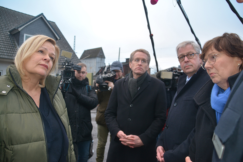 Betroffenheit ob der schrecklichen Tat: Bundesinnenministerin Nancy Faeser (l.) kam mit Ministerpräsident Daniel Günther (2. v. l.) und Sabine Sütterlin-Waack, Innenministerin des Landes Schleswig-Holstein, zum Unglücksort. Begleitet wurden sie unter anderem von Steinburgs Landrat Claudius Teske. Foto: Otto