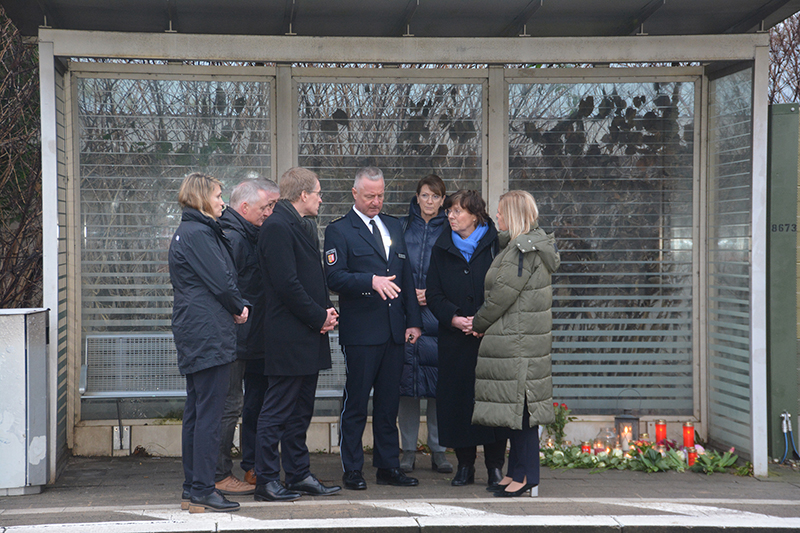 Am Donnerstagnachmittag traf dann Bundesinnenministerin Nancy Faeser am Unglücksort ein, um sich persönlich ein Bild von der Lage zu machen, Beistand zu leisten und dem Land zur Seite zu stehen. Mit Ministerpräsident Daniel Günther und Innenministerin Sabine Sütterlin-Waack legte sie Blumen im Bahnhofs-Wartehäuschen für die Opfer ab – an der Stelle, an der bereits viele Bürger Kerzen aufgestellt und Blumen abgelegt hatten. Begleitet wurde Faeser unter anderem von Brokstedts Bürgermeister Clemens Preine, Landrat Claudius Teske, Frank Matthiesen, Leiter der Itzehoer Polizeidirektion sowie Vertretern der Bundepolizeidirektion Bad Bramstedt. In den „Bürgerstuben“ fand dann ein Gespräch mit den Einsatzkräften von Bundespolizei, Landespolizei, Vertretern von Hilfsorganisationen und Seelsorgekräften statt. Ihnen allen und den Bürgern, die spontan geholfen haben, dankte die Bundesinnenministerin in besonderem Maße. „Wie konnte diese Tat passieren? Wie konnte es dazu kommen, dass der Tatverdächtige trotz so vieler Vorstrafen so früh aus der Haft entlassen wurde?“, fragte sie. „Wir sind alle miteinander im Austauch“, so Faeser. Denn die Tat müsse möglichst schnell aufgeklärt werden.