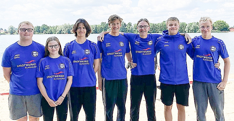 Die Gruppe der Elmshorner Freiwasserschwimmer bestand aus Mette Tschirner, Kiara Boyens, Johannes Liebmann, Kolja Dieckmann, Lasse Tschirner, Bennet Fiefeck und Kjell Boyens. Sie hatten sich im Naturbad Oberglinde auf die langen Strecken vorbereitet.
