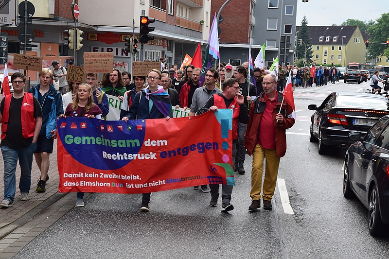 In Elmshorn versammelten sich anfangs bei einer Kundgebung auf dem Alten Markt 150 Bürger, schätzte die Polizei. An einem Protestzug durch den Wedenkamp, die Gerber-, Schul-, Holsten- und Königstraße beteiligten sich nach Angaben der Veranstalter mehr als 230 Personen. Sie trugen Plakate mit Aufschriften wie "Gemeinsam dem Rechtsruck entgegen!", "Nazis raus", "Katzis statt Nazis", "Jeder ist wertvoll", "Ohne entschiedene Maßnahmen wird unsere Erde so heiß wie ein Fusionreaktor", "Omas For Future". Zu sehen waren Fahnen von SPD, DGB, ödp, Fridays For Future. Die Polizei sperrte für den Umzug jeweils eine Straßenseite ab.