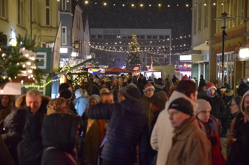 Barmstedt (jhf) Großer Andrang am ersten Abend des Barmstedter Weihnachtsmarkts: Schneeflocken rieseln, Menschen strömen am Abend dicht an dicht an den gemütlich beleuchteten Ständen vorbei. Bei eisiger Kälte wärmen sie sich an heißen Würstchen und Glühwein. Auf der Bühne vor dem Rathaus sorgt das Duo Ruby und Sina für Musik.