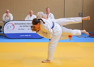 Nach Absolvieren der Grundtechniken von Ausweichen, Schlägen und Tritten sowie des Hebelns, Würgen, Transporttechniken und Würfen zeigte Grickschas mit ihrer Partnerin Gaby Blankenburg-Hollender (2. DAN) unbewaffnete und bewaffnete Abwehrtechniken. Die DAN-Grade sind die Meistergrade im Jiu-Jitsu.