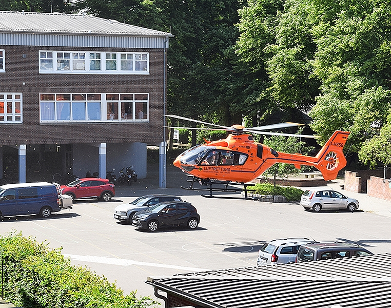Elmshorn (jhf) Großes Erstaunen bei den Schülerinnen und Schülern der Bismarckschule Elmshorn: Auf dem Schulhof des Gymnasiums landete am Freitag um 14 Uhr ein Rettungshubschrauber. Die Bundeswehrmaschine "Christoph 29" brachte einen Notarzt aus Hamburg-Wandsbek in die Krückaustadt. Der Mediziner war zu einem internistischen Notfall an der Schulstraße gerufen worden. Ein Krankenwagen war bereits vor Ort. Zuvor hatte sich die Polizei vorsorglich auf der Kreuzung Feldstraße, Schulstraße, Holstenstraße postiert - wahrscheinlich um dem Piloten auch dort eine Landung zu ermöglichen.